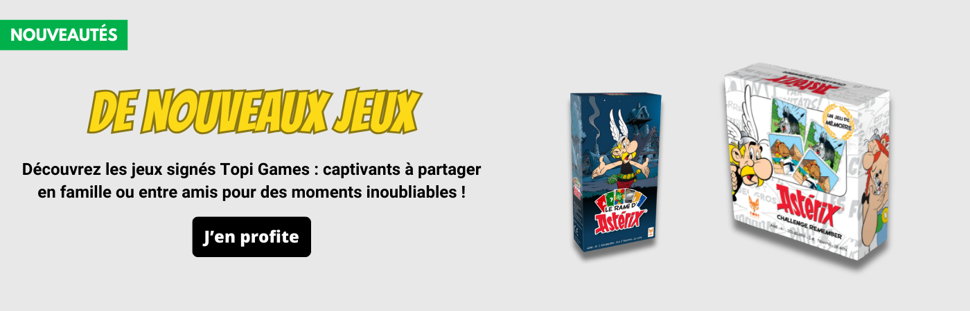 Commandez dès à présent tous vos jeux Astérix et Obélix préférés directement sur notre boutique officielle. Puzzles, jeux vidéo, jeux de cartes et jeux de société autour de votre village gaulois favoris: vous trouverez forcément une version adaptée à vos envies pour vous amuser entre amis, à plusieurs joueurs ou en solo. Retrouvez Astérix, Obélix et tout le village gaulois dans nos offres de jeux ! Les visuels des jouets sont inspirés des dessins et scènes cultes de l’œuvre de René Goscinny et Albert Uderzo. Retrouvez les plus grandes licences de jeux pour satisfaire un maximum de fans du village gaulois, enfants comme adultes. Parmi elles, Playmobil, célèbre créateur de jouets pour enfant et adulte, ou encore le célèbre jeu du studio Microïds, Astérix et Obélix XXL - Le Bélier d’Hibernie disponible sur Nintendo Switch. Si vous êtes un passionné des aventures d’Astérix et Obélix, vous apprécierez la richesse des détails des jeux proposés sur la boutique officielle.Les affiches et posters Astérix