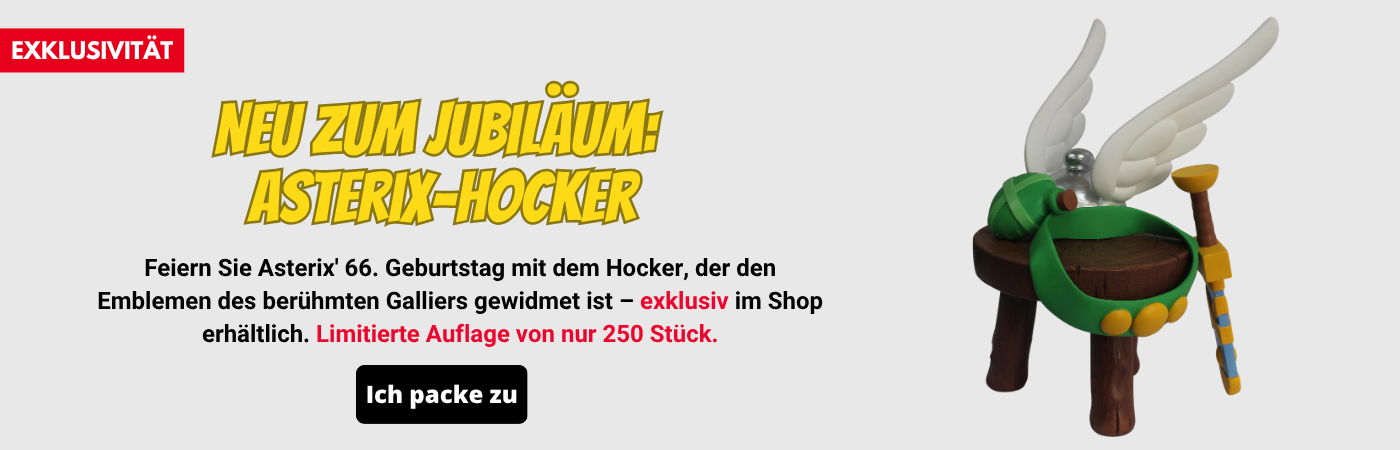 An alle Fans der Abenteuer von Asterix und dem berühmten Dorf der unbeugsamen Gallier: Alle Artikel aus dem Universum von Albert Uderzo und René Goscinny können im Online-Shop von Hachette Collections gekauft werden. Qualitätsprodukte, die von den berühmtesten Kunsthandwerkern handbemalt wurden, in limitierter Auflage, exklusiv oder als Sonderangebot, Sammlerboxen, von den Zeichnern signierte Ausgaben... welchen Artikel aus dem Universum von Albert Uderzo Sie auch immer suchen, Sie werden ihn mit Sicherheit in der Asterix-E-choppe finden! Alben, Sammelfiguren, Brett- und Videospiele, Poster und Dekorationen sowie exklusive Zeichnungen von Seiten aus den Abenteuern von Asterix und Obelix können Sie jetzt alle in unserem offiziellen Shop kaufen, im Set oder einzeln. Hier finden Sie alle Sammlerstücke Ihrer Figuren, egal ob Sie eher ein Fan von Cäsar und seinen römischen Legionärstruppen oder ein unverbesserlicher Verteidiger unseres geliebten Galliens sind. Kleopatra, Idefix, Obelix (natürlich!). Miraculix, Assurancetourix, Bonnemine, Abraracourcix ... so viele warten am Asterix-Schuppen auf Sie? Beeilen Sie sich! ...Asterix-Sammelfiguren: Alle Figuren in limitierter Auflage