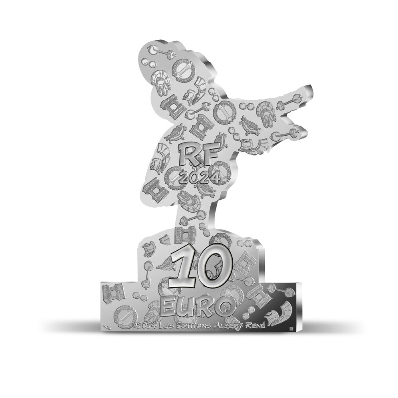 Diese Münze, deren Form vom Titelbild Albums „Asterix bei den Olympischen Spielen“ inspiriert ist, verewigt den berühmtesten aller Gallier auf dem Höhepunkt seines Ruhmes. Asterix posiert stolz auf der obersten Stufe des Siegertreppchens und hält einen Lorbeerzweig, das Symbol seiner Erfolge bei den Wettkämpfen. Die Rückseite der Münze ist mit verschiedenen Symbolen geschmückt, die an Sport und Olympia erinnern. Sie zeigt den Nennwert der Münze, das Jahr und das Kürzel RF für „République Française“ (Französische Republik).