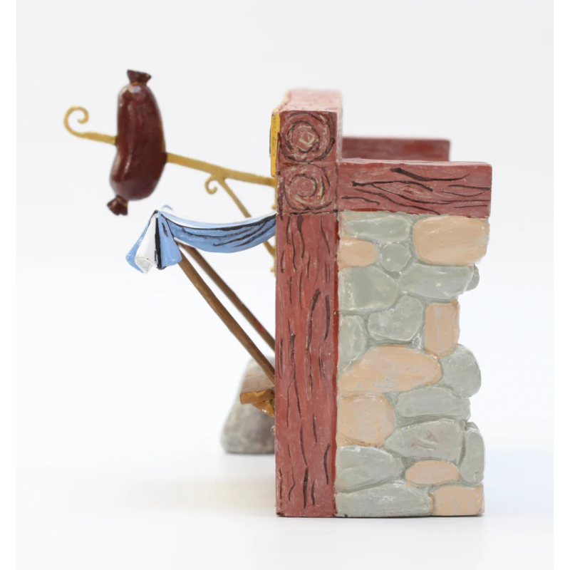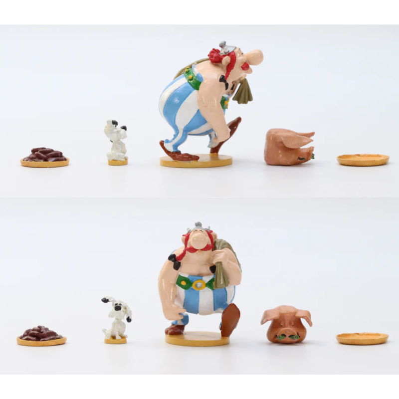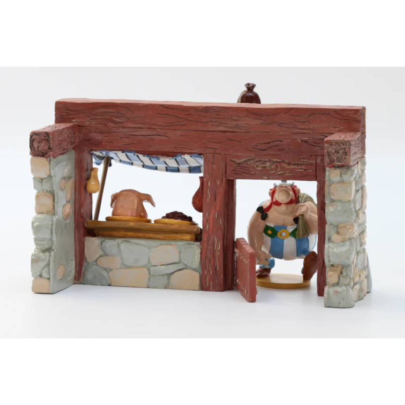 Diese wunderschöne Figur zeigt Obelix und Idefix, wie sie den Laden „Charcutier - Alimentation“ betreten, bereit, ein leckeres Wildschwein abzuholen.