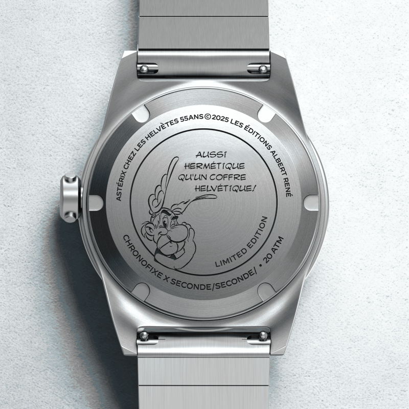 Für diese zweite Zusammenarbeit stellt sich Seconde/Seconde/ Asterix mitten in einer geheimen Operation vor: das Ohr am Zifferblatt, die Hand auf der Lünette, bereit, die Geheimnisse eines Schweizer Tresors zu lüften. Der gravierte Gehäuseboden setzt die Geschichte mit einer exklusiven Illustration und dem Vermerk fort: „Aussi hermétique qu’un coffre helvétique !“.