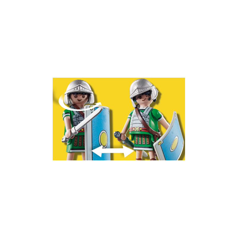 Jede Figur ist mit Helm, Schild und Waffe ausgerüstet. Die Gesichter sind wendbar, sodass du im Handumdrehen von einem selbstbewussten, kriegerischen Ausdruck zu einem Ausdruck völliger Niederlage wechseln kannst. Stützplatten sorgen für Stabilität der Figuren, selbst nach einer Begegnung mit Obelix.