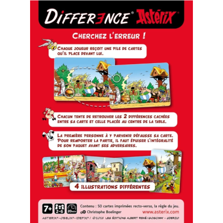 Tauche ein in die Welt von Asterix mit „Asterix Différence“, einem lebhaften Beobachtungsspiel, bei dem dich jede Karte mitten ins Herz der bekanntesten Szenen im gallischen Dorf entführt. Festmahl, Schule, Zaubertrank, Omnibus … jede Illustration birgt witzige Details, die nur darauf warten, entdeckt zu werden. Ein dynamisches, lustiges und unglaublich geselliges Spiel, perfekt für gemeinsame Stunden mit Freunden oder der Familie. Ihr werdet lachen, staunen, euch gegenseitig herausfordern … und immer wieder spielen wollen.