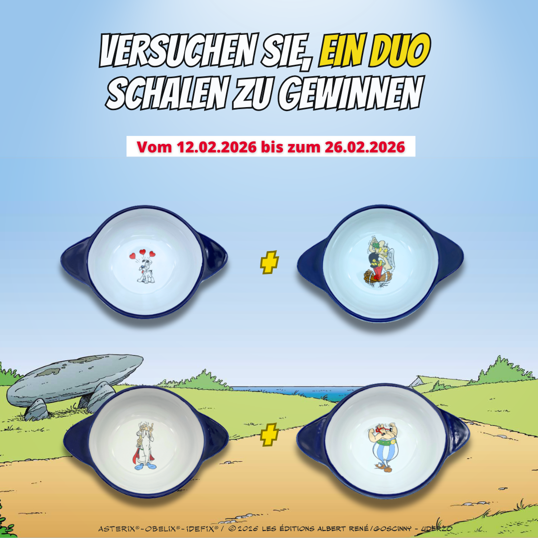 Der Astérix-Shop bietet Ihnen die Chance, 2 bretonische Schalen zu gewinnen. Sie eignen sich perfekt für Ihr Frühstück – natürlich zusammen mit Ihrer Lieblingsfigur! Es gibt 2 Sets mit je 2 Schalen zu gewinnen.