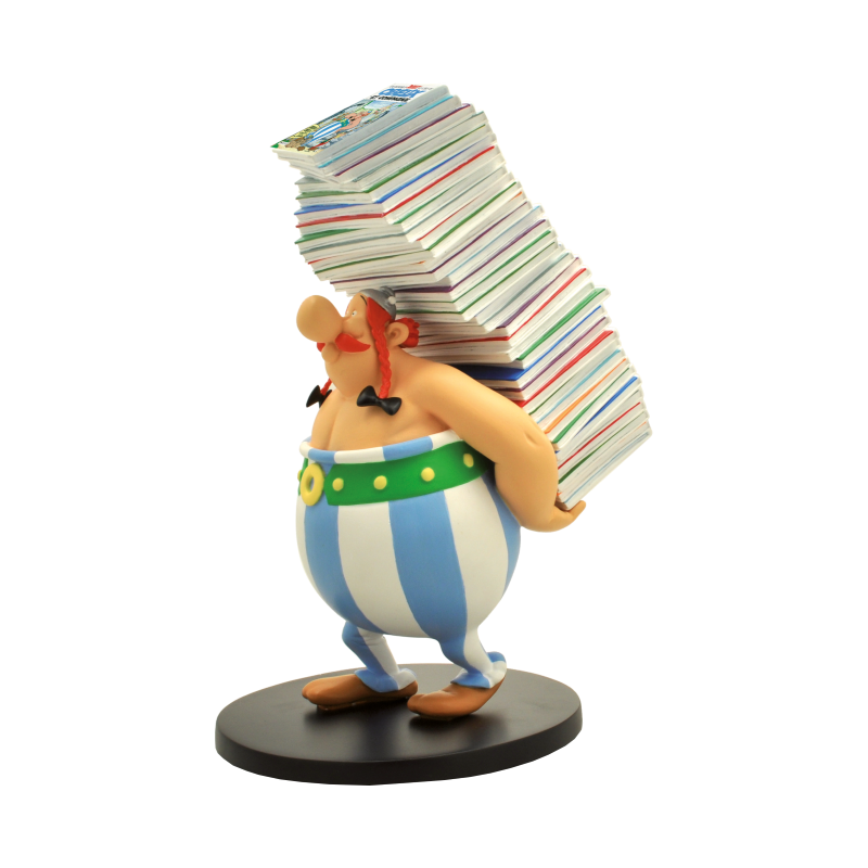 Treffen Sie Obelix und seinen Stapel von Alben mit den Abenteuern der Gallier.
