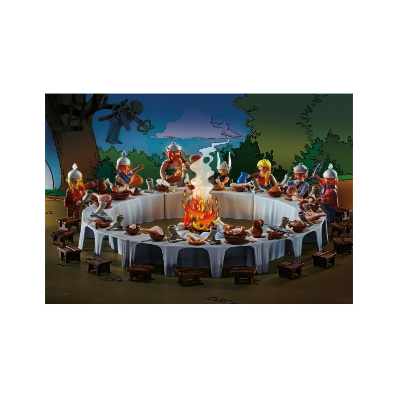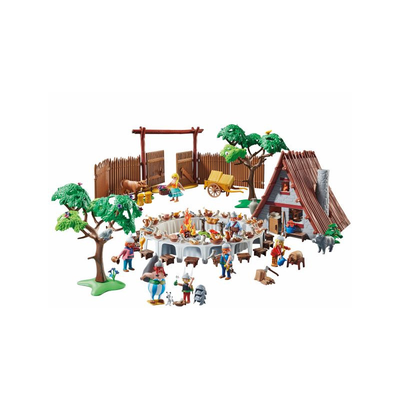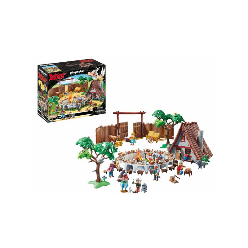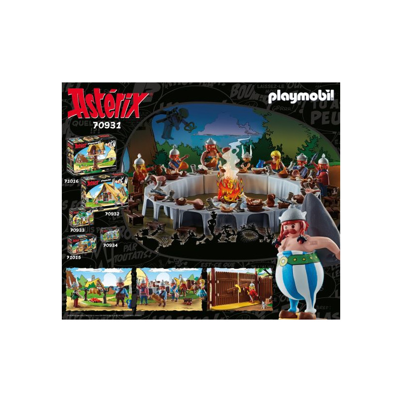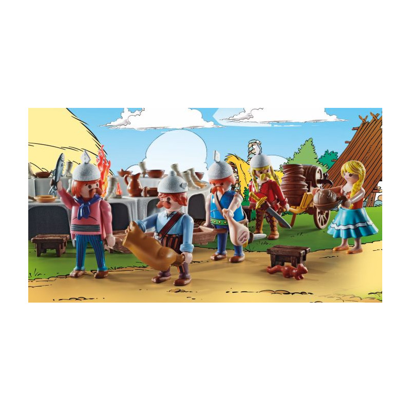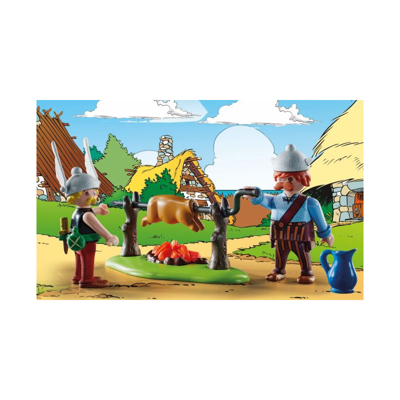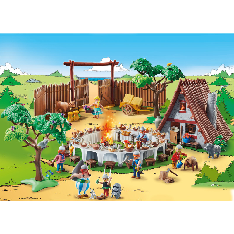 Die große Festtafel ist bereits gedeckt und ein köstliches Wildschwein steckt am Spieß. Bevor das Fest beginnen kann, bringt Obelix noch schnell seinen Hinkelstein zu Asterix' Hütte und legt ein paar Knochen in Idefix' Napf, dann geht es dem Wildschwein an den Kragen!