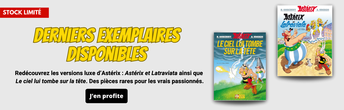Replongez-vous en pleine Gaule avec les albums d’Astérix des auteurs, scénaristes et dessinateurs René Goscinny, Albert Uderzo, Jean-Yves Ferry et Didier Conrad dès maintenant sur la boutique officielle Hachette Collections. Commandez et recevez en livraison les tomes de vos aventures d’Astérix et Obélix préférées, aux éditions Albert René. Vos histoires d’Astérix dans des formats d’albums variés et au meilleur prix. Des éditions luxe, des coffrets collectors, des tirés à part inédits issus de véritables crayonnés réalisés par les auteurs eux-mêmes, des séries limitées, numérotées et signées par le dessinateur Didier Conrad… de nombreuses surprises vous attendent dans l’é-choppe d’Astérix ! Agrandissez votre collection d’Astérix avec des albums collector et retrouvez vos personnages favoris dans des dessins inédits. Les aventures des personnages les plus emblématiques d’Albert Uderzo et René Goscinny sont au rendez-vous: Obélix (évidemment !), Idéfix, Panoramix, Cléopâtre, sans oublier César et ses légions de romains et bien d’autres encore. Nos produits de qualité sont à retrouver en ligne sur la boutique officielle d’Hachette Collections.Les BD Astérix les plus recherchées disponibles sur notre boutique en ligne