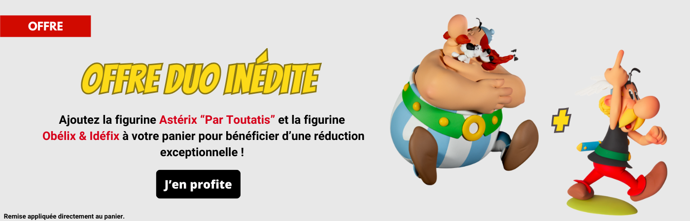 Les figurines collector résinées d’Astérix et Obélix sont disponibles à l’achat en ligne. Seuls ou en duo, commandez les figurines de vos personnages favoris dès maintenant. Si vous aimez les collectoys Astérix ou les figurines Obélix, vous allez adorer retrouver Astérix et Obélix dans nos figurines de collection en duo disponibles à l’achat sur notre boutique officielle.Nos figurines des autres personnages d'Astérix : Panoramix, Idéfix, Assurancetourix ou Falbala !