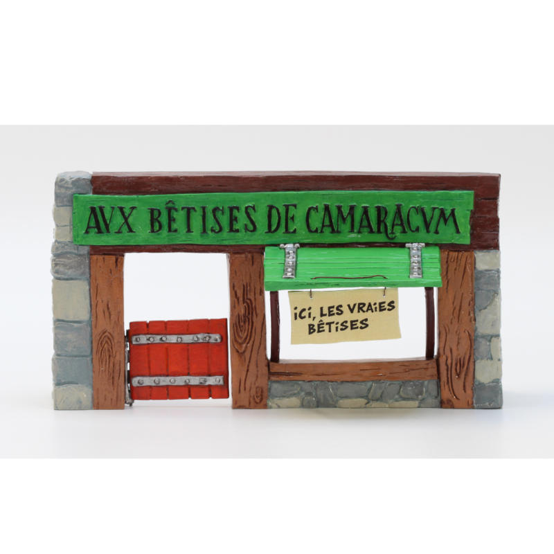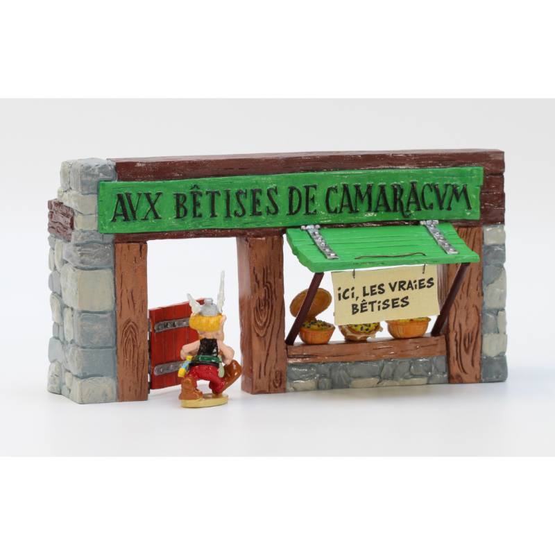 Inspirée d’une scène culte du Tour de Gaule d’Astérix, cette figurine en métal représente Astérix s’arrêtant dans une boutique emblématique pour y déguster les fameuses "bêtises" locales.