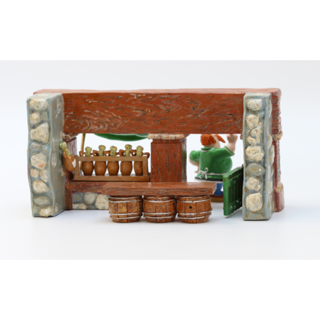 Cette superbe figurine met en scène le marchand de vin devant sa boutique.
