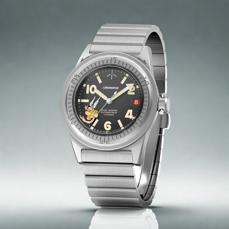 Pour cette deuxième collaboration, Seconde/Seconde/ imagine Astérix en pleine opération secrète : oreille collée au cadran, main sur la lunette, prêt à percer les secrets d’un coffre suisse. Le fond de boîte gravé poursuit l’histoire avec une illustration exclusive et la mention : “Aussi hermétique qu’un coffre helvétique !”.