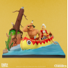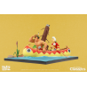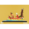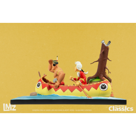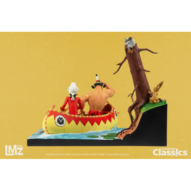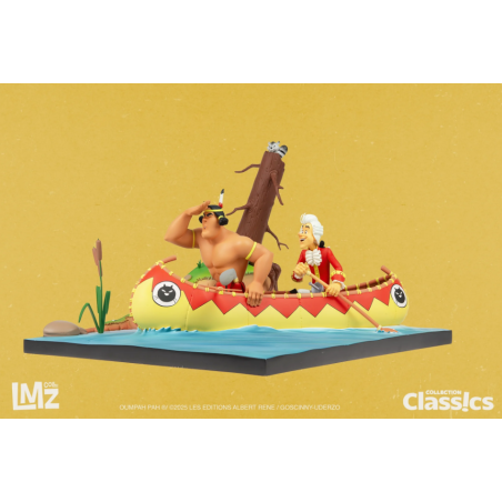 À bord de leur canoë, les deux héros glissent sur une rivière paisible, sous le regard amusé d’un lièvre farceur et d’un petit rongeur curieux. Chaque détail, expressions, postures, décor, a été sculpté avec passion par Yann Berthonneau, puis moulé, peint et assemblé à la main, dans le respect de l’univers graphique d’Uderzo.