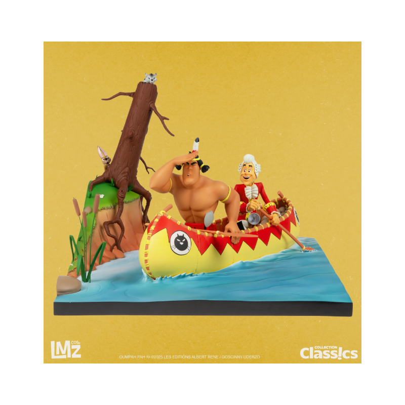 Découvrez la figurine exclusive d’Oumpah-Pah et Hubert en canoë : une création artisanale pleine de charme, d’humour et de détails fidèles à l’univers d’Uderzo.
