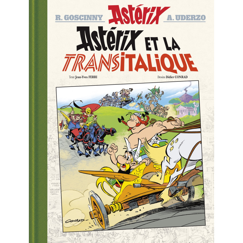 Cette édition en grand format (26 x 36,5 cm) du nouvel album Astérix et la Transitalique comprend 128 pages, avec dos carré toilé et tranchefile. Deux types de papier différents sont utilisés pour réserver le plus bel écrin à une grande variété de créations graphiques.