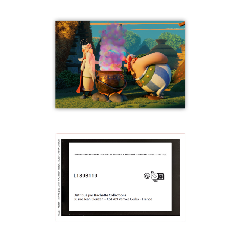 L'image, tirée de la série, montre Panoramix en train de concocter la fameuse potion magique. Obélix profite de cette occasion pour sentir l'odeur de la potion qu'il aime tant.