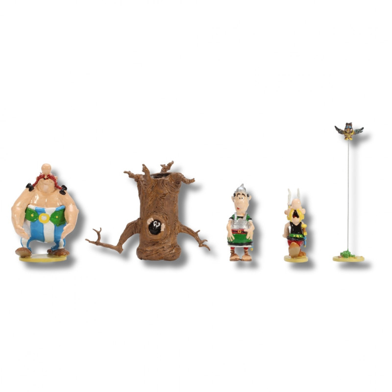 Cette ensemble est composé d'un Obélix de 6 cm, d'un Astérix de 4,4 cm, d'un hibou suspendu de 8,5 cm et d'un déguisement d'arbre de 5,8 cm dans lequel peut être glissé le légionnaire Plutoqueprévus de 4,7 cm.